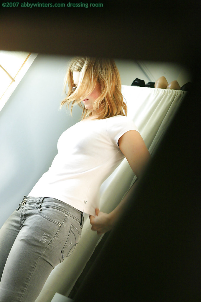A secret camera captures a young teenie blonde pulling on pink panties over behind