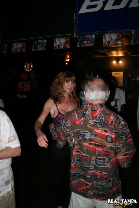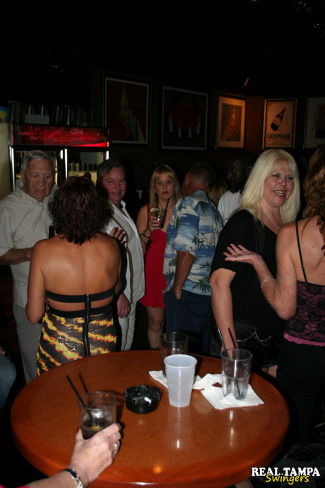 Insatiable swinger wives show off their huge boobs and lick hard dongs in public