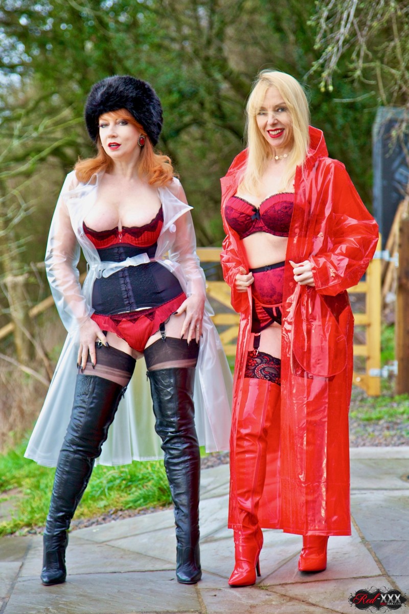 British lesbians expose boobies while modelling raincoats and thigh-high boots