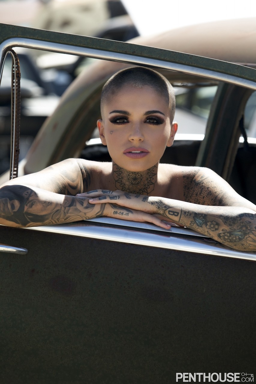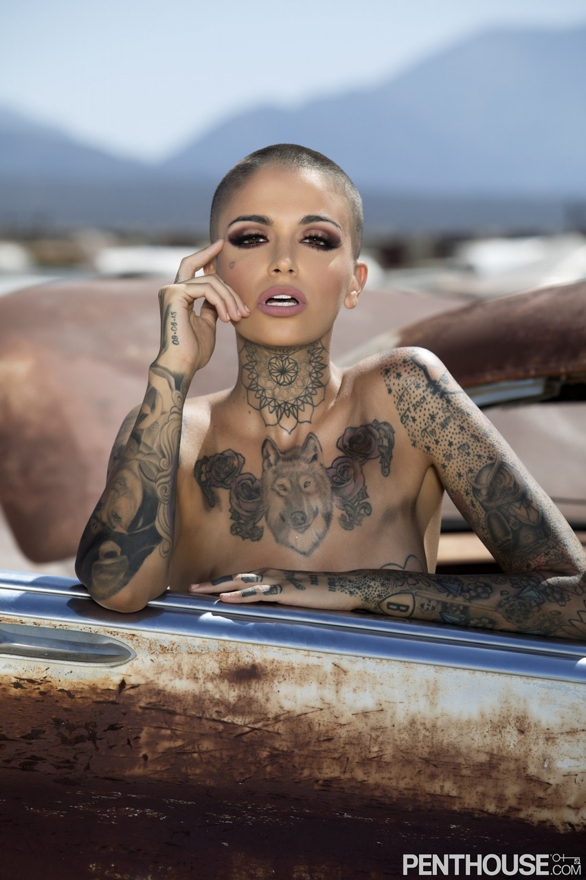 Bald inked babe Leigh Raven flaunts her small boobs and poses naked outdoors
