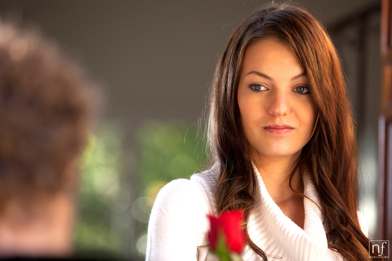 Gorgeous young young brunette Alexis Venton in mini dress & boots kissing boyfriend