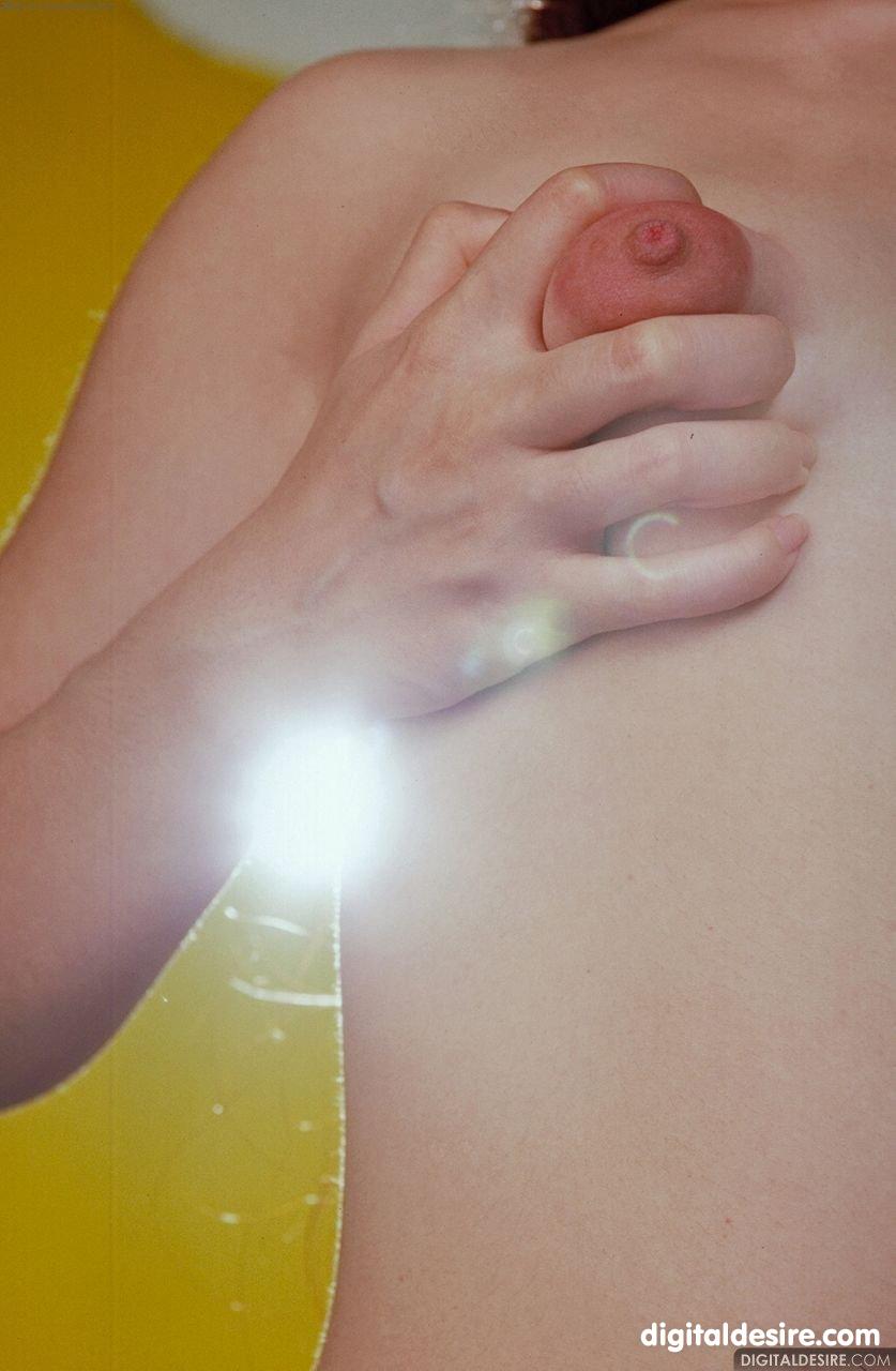Sweet brunette Deja Chan plays with her puffy nipples & shows her shaved pussy