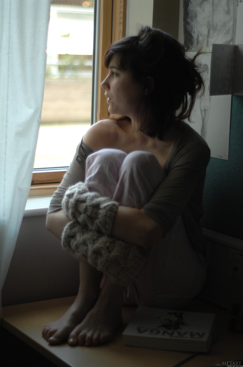 Thin teenie Estelle K gets undressed in fingerless gloves while reading a Manga book