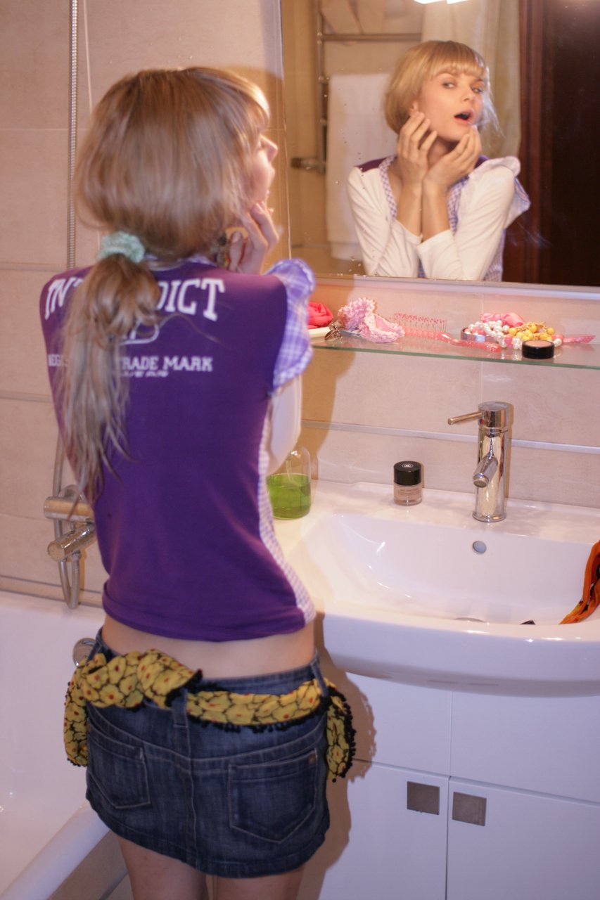 Innocent teenie babe Katie washes her slender body before putting her clothes on