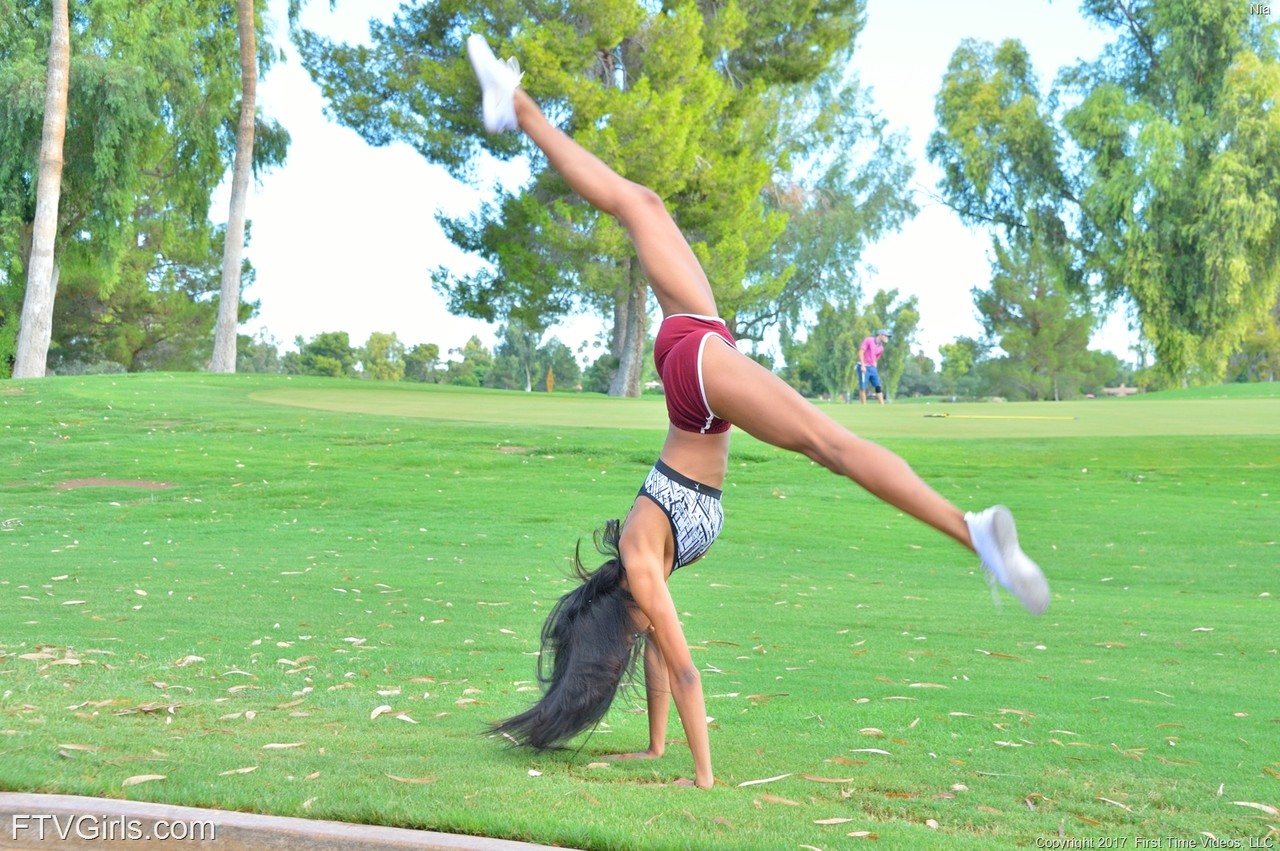 Sporty glamour babe Nia strips totally naked while jogging in public