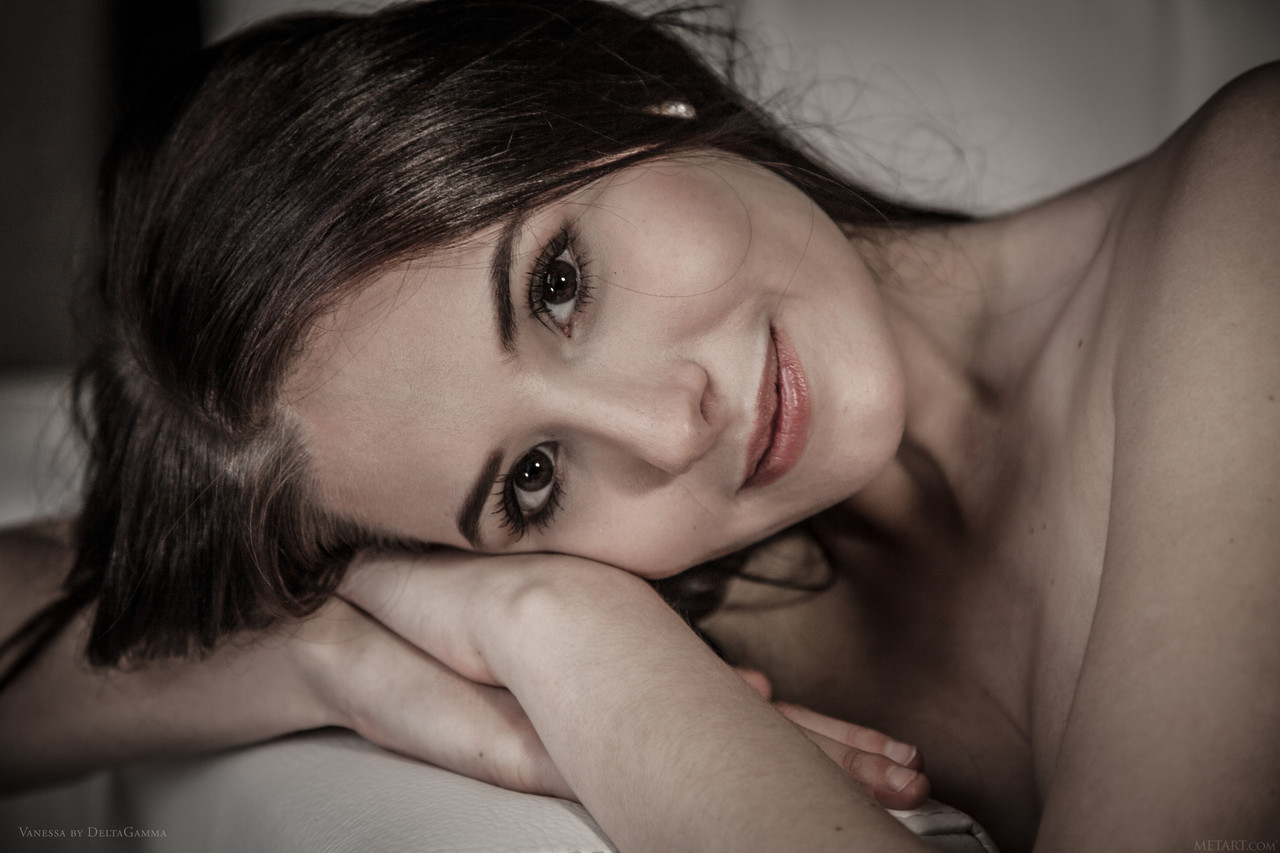 Charming teenie Vanessa Angel shows her tiny boobs and shaved vagina in a solo