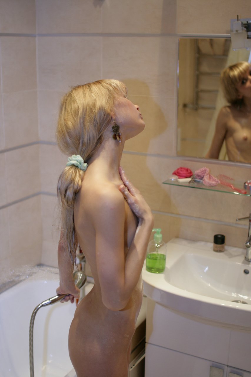 Innocent teenie babe Katie washes her slender body before putting her clothes on