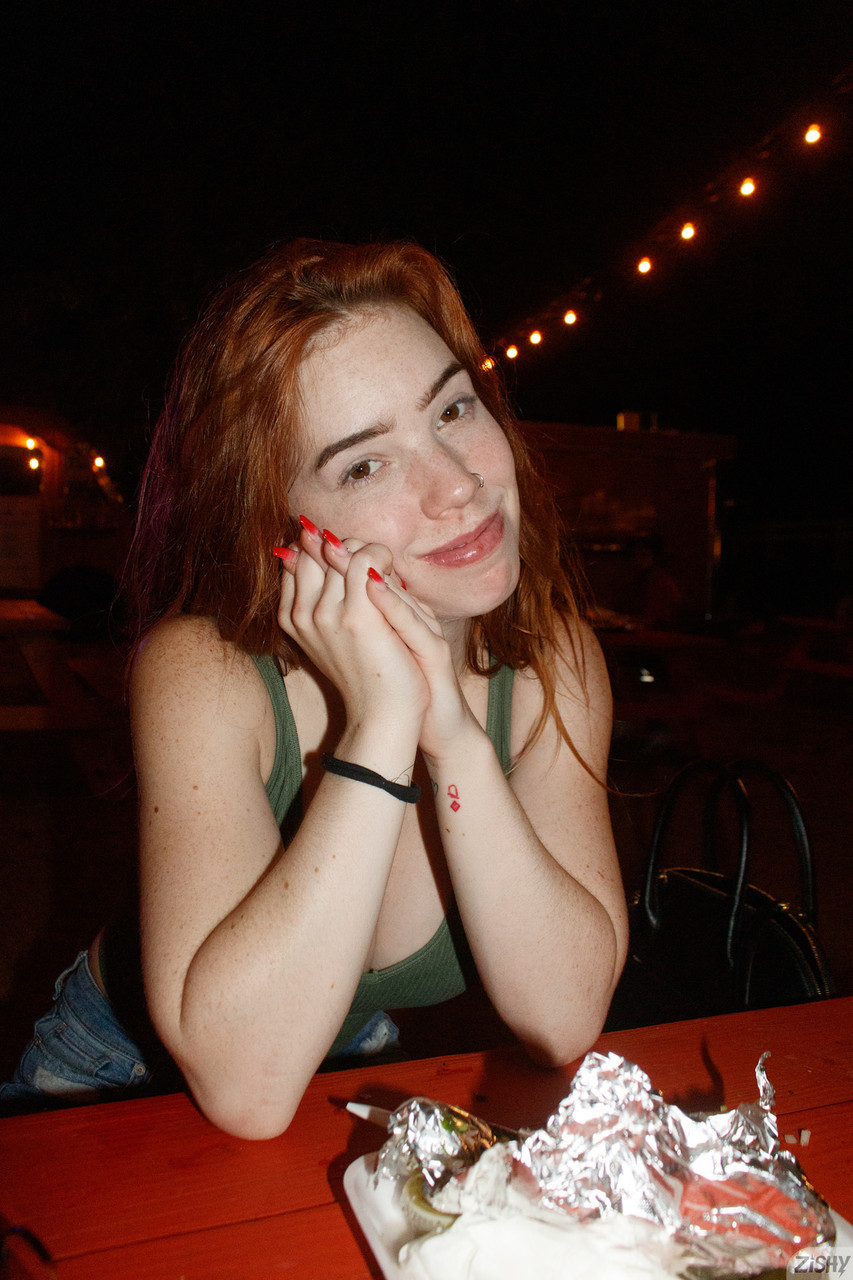Nerdy redhead Nala Brooks flashes her enormous tit in public & strips undressed at home