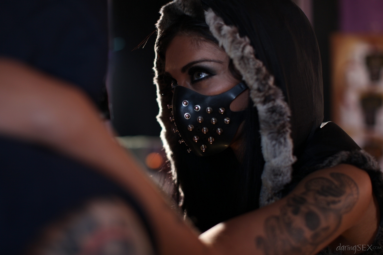 Masked brunette skank girlfriend chick with a corset Mai Bailey bares her humongous natural titties