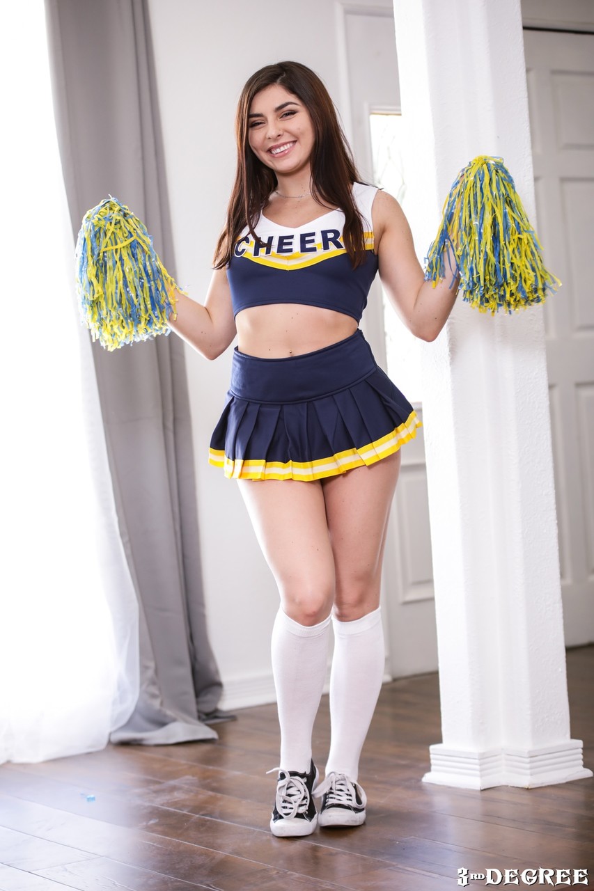 Short cheerleader strips off her lovely uniform and mounts a big black boner