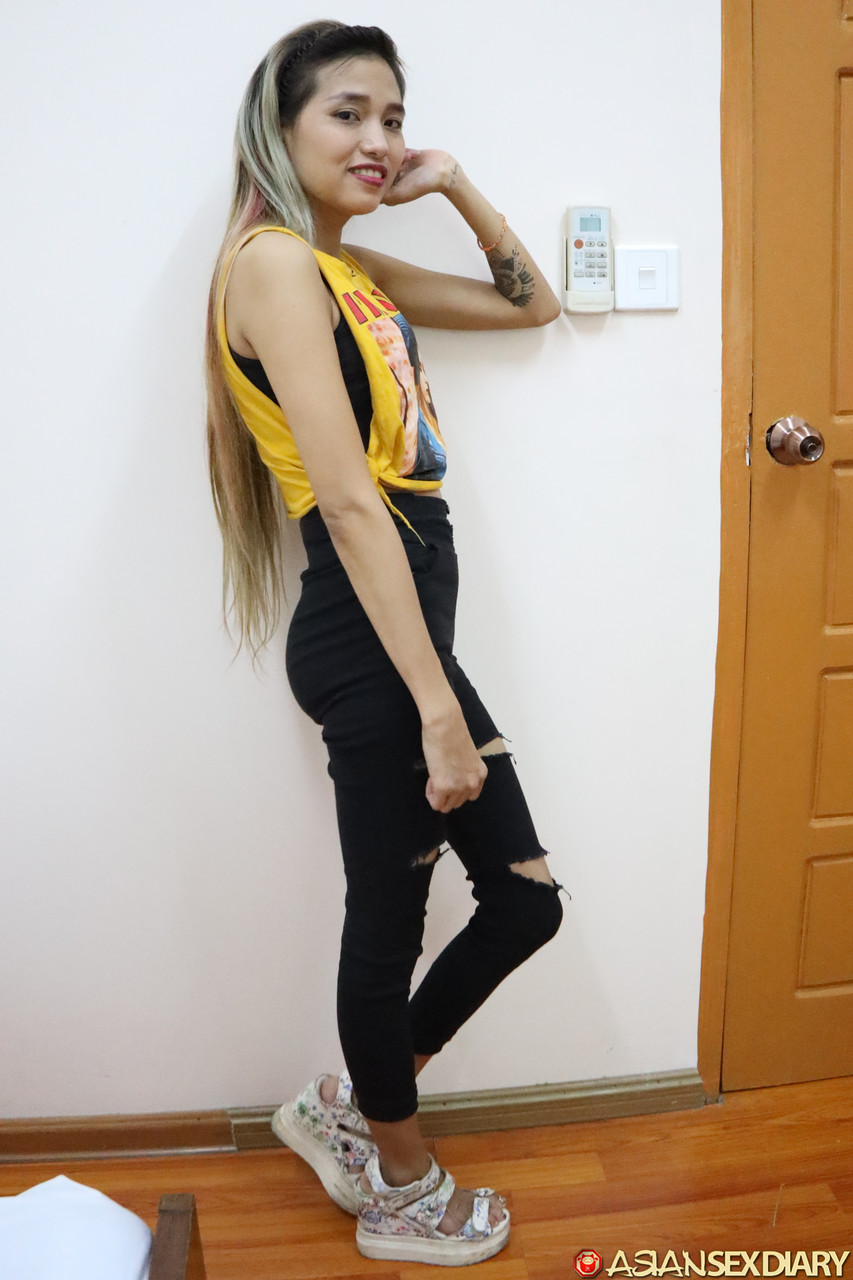 Thin yellow-haired Thai skank GF woman Roann shows her figure and gets sexed in a POV show