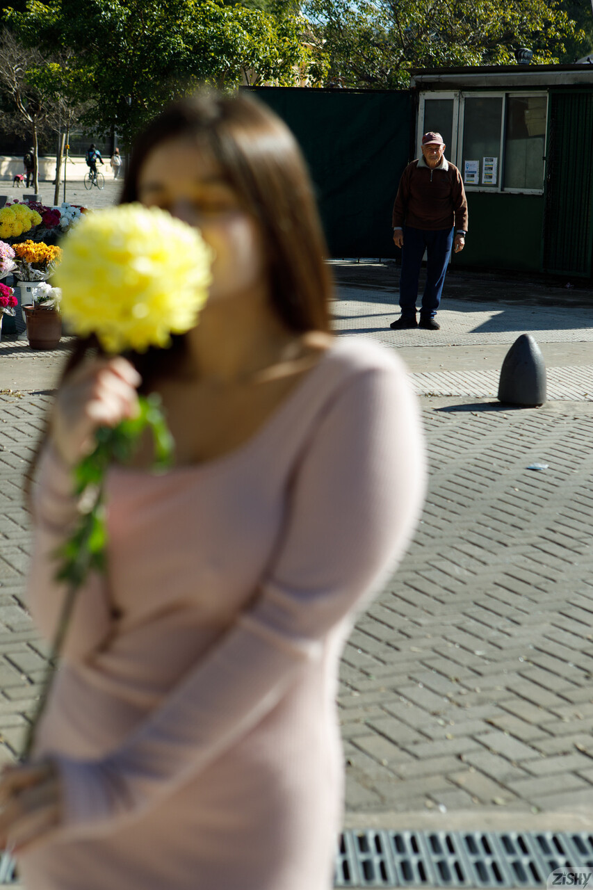 Kinky brunette amateur Clara Tribech shows her big titties outdoors